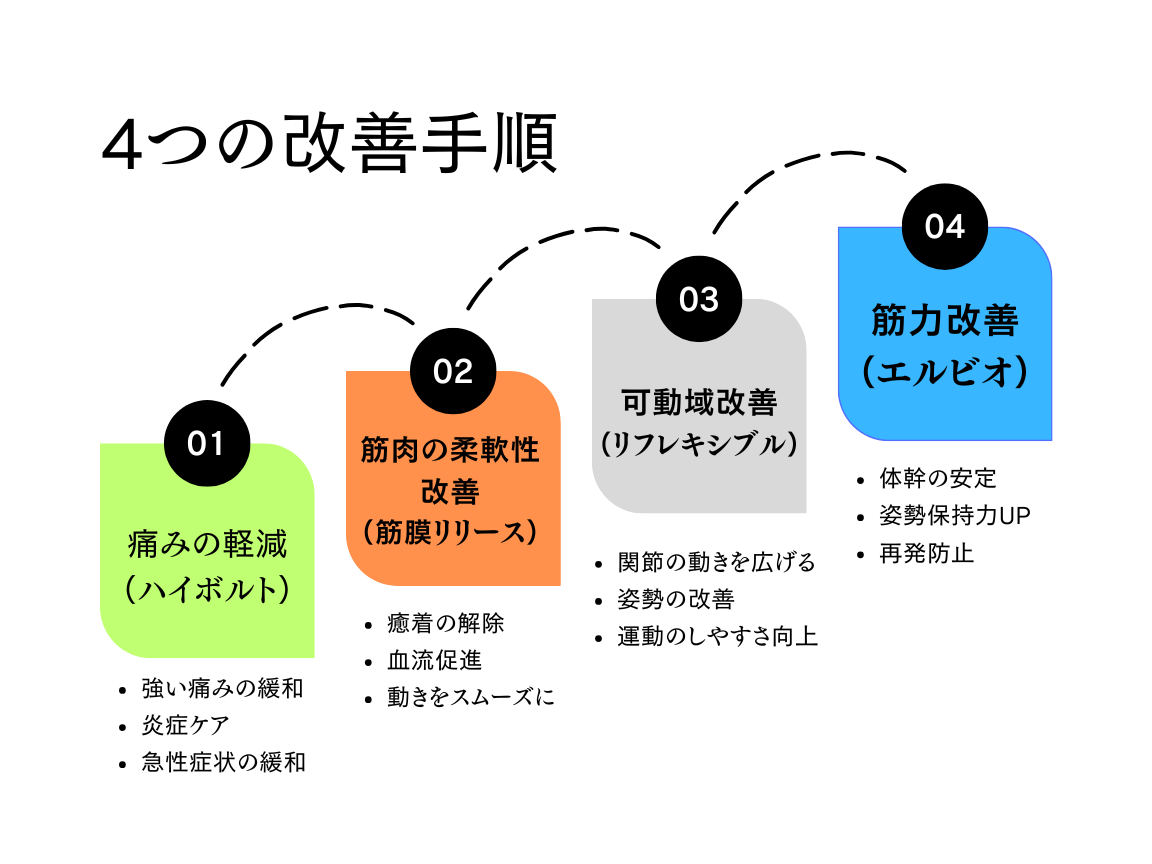 ハイボルトで痛み軽減 → 筋膜リリースで柔軟性改善 → リフレキシブルで股関節可動域改善 → EMSで再発予防