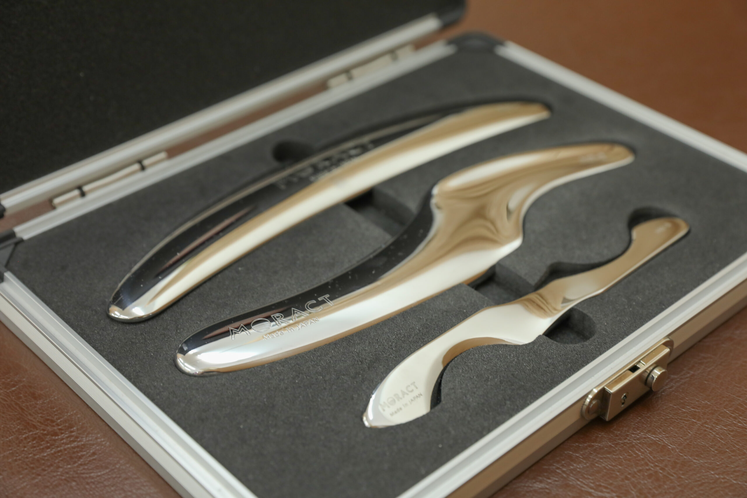 当院では筋膜リリースの施術にモアクトと呼ばれる特殊な形状をした金属性のブレードを使用します。